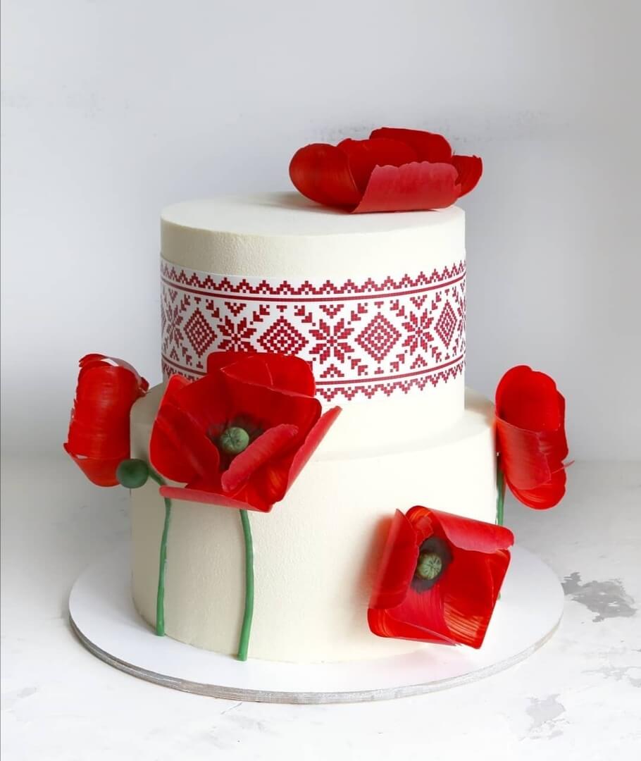 Яркий элемент этно-свадьбы в виде безумно вкусного торта с цветочно-маковым оформлением