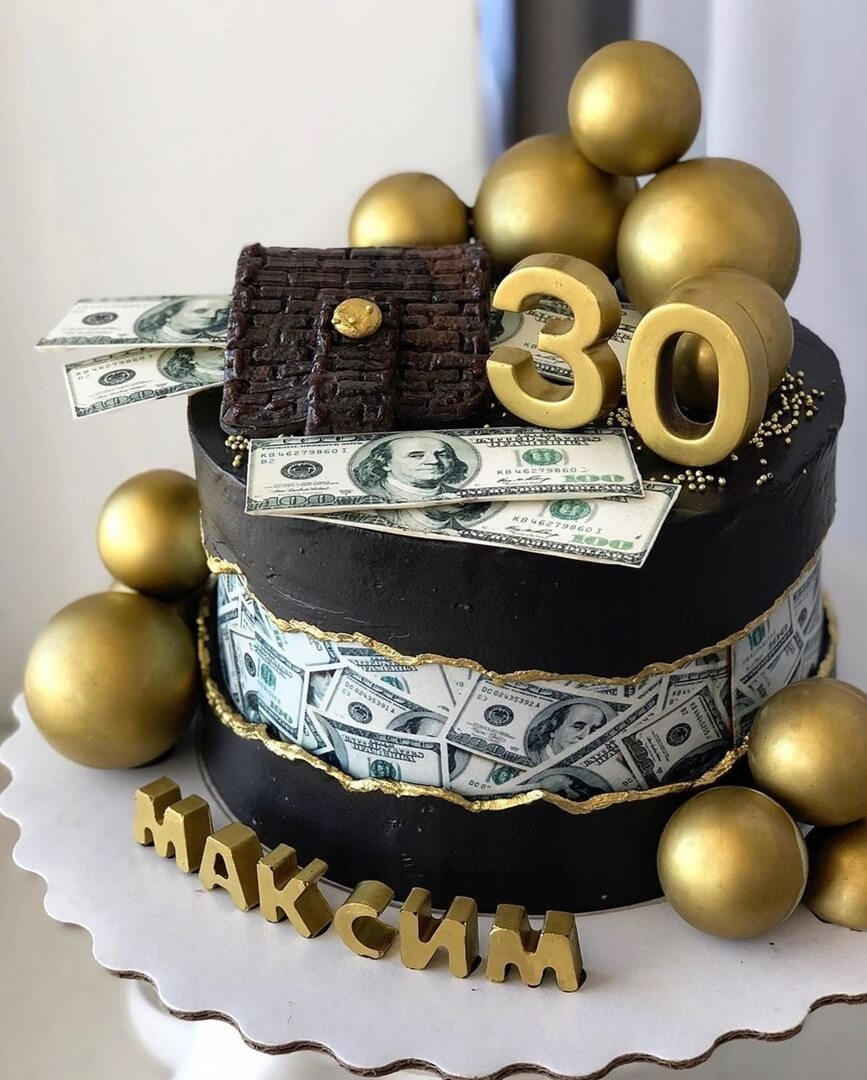 Шикарнейший и стильный черный тортик с украшением из золотых шаров и прослойки сладких денег